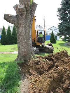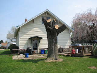 This is the back of my house. That tree was just HUGE and totally rotted inside… can you believe that guy is just standing up there cutting it down? Yikes. Anyway, he trimmed it up to make way for Jeff’s Uncle John to rip it out.