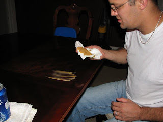 Last year we got one of those white heat stains on our cherry wood table. Jeff looked up on YouTube (which is such an authority on furniture, right?) how to remove this and saw that you could goop peanut butter on it and it’ll come off. Obviously this sounds ridiculous so I had to take pics. It does NOT work. Repeat, do not try this at home.
