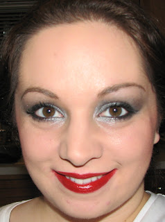 The lips are red enriched cremestick liner with Cockney lipstick (both MAC)