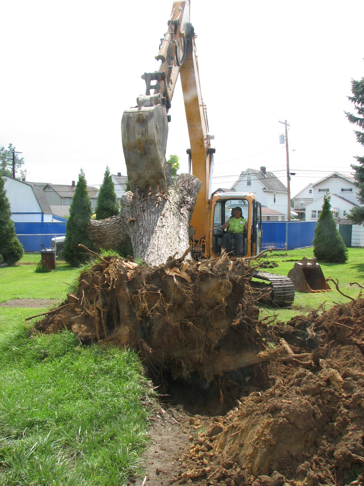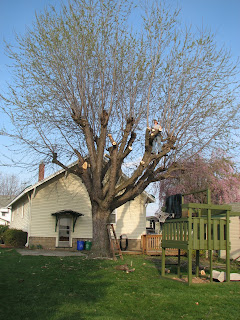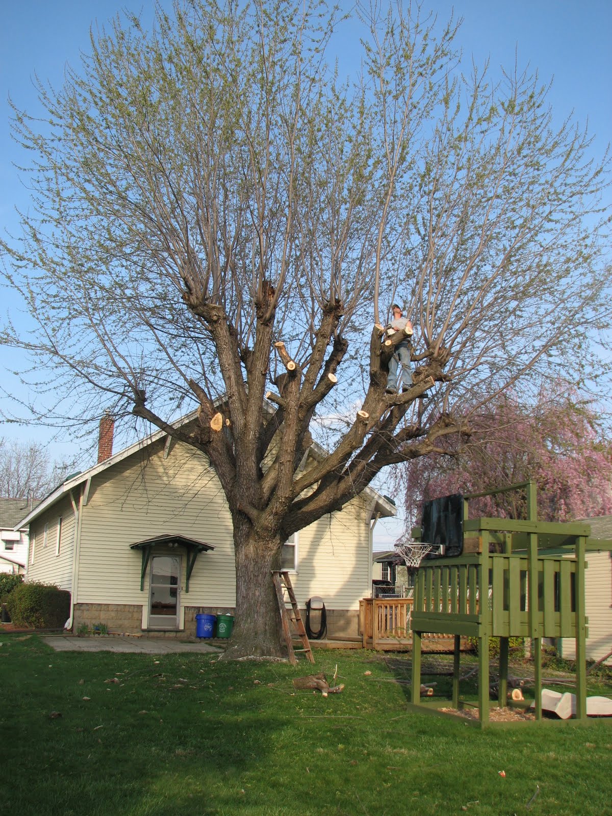 This is the back of my house. That tree was just HUGE and totally rotted inside… can you believe that guy is just standing up there cutting it down? Yikes. Anyway, he trimmed it up to make way for Jeff’s Uncle John to rip it out.