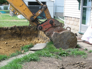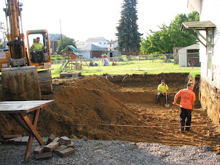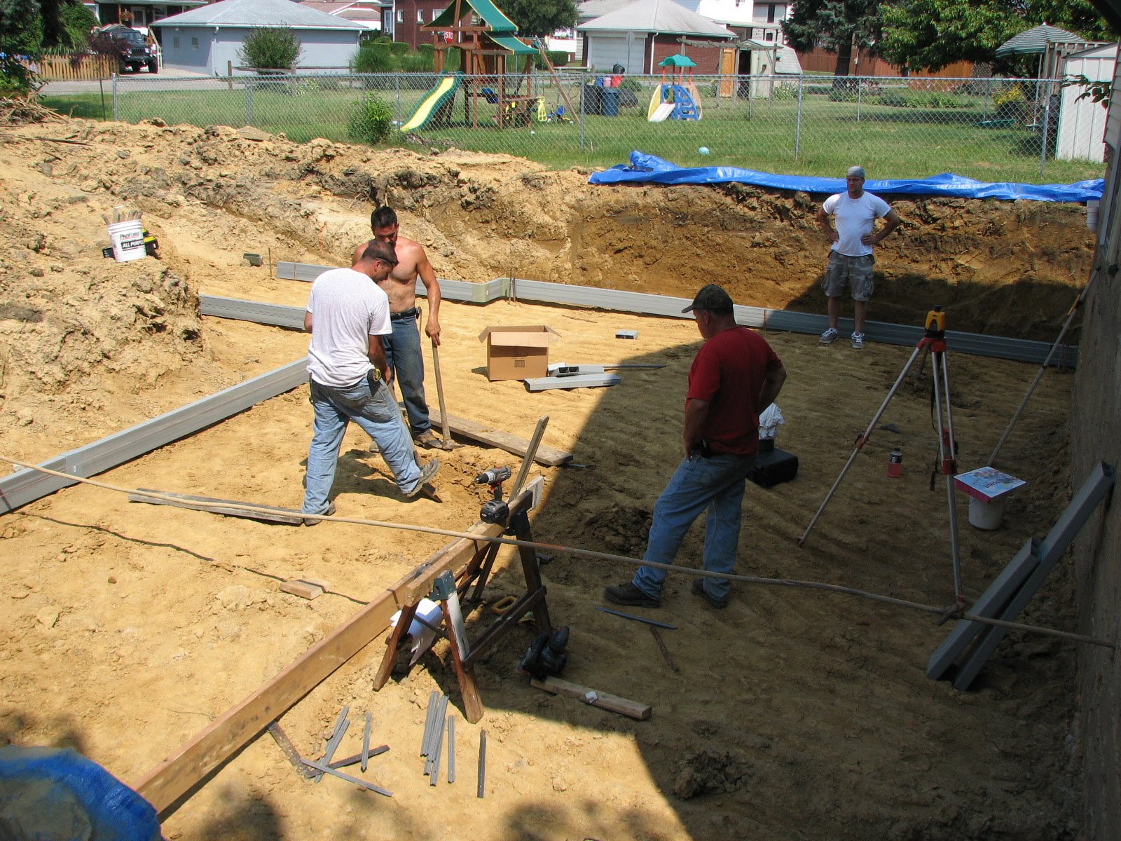 That line in the last photo is the water line, which was eventually re-routed… DH is in the orange and his cousin Johnny is in the bright yellow. At this point it was still a family affair of work!
