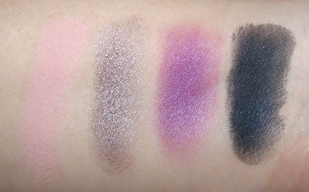 Shop & Drop is a cool mix of pink, purples, and blues. The four shades are - Sugar Snack (light pink, matte); Hypnotizing (frosted greyed mauve, frost); Power Boosted (violet, veluxe pearl); and Shop & Drop (deep blue, satin).