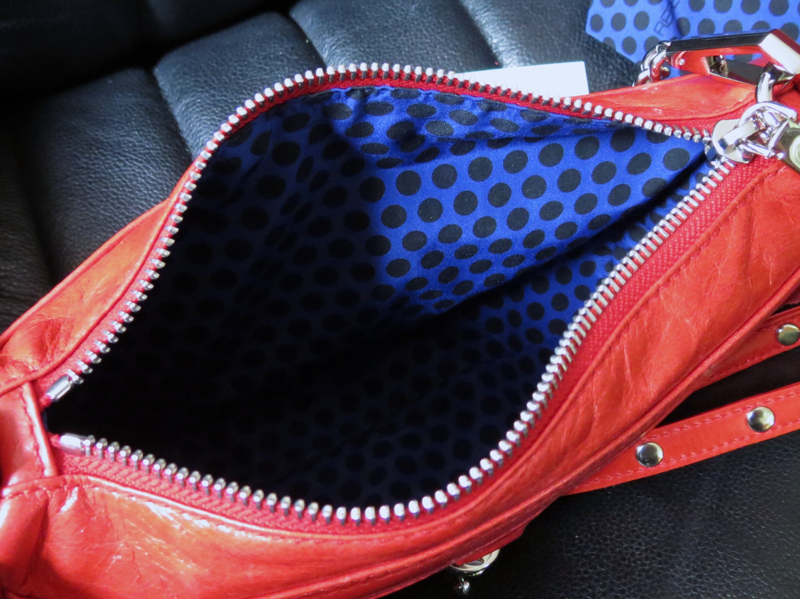 The exterior is a beautiful, rich tomato red leather with silver hardware and long tassels. The perfect POP of color! The strap length is perfect. It’s long enough that it’s a cross body, but not so long that it’s bouncing off of your derriere. The strap is also removable, turning this cross-body bag into a clutch.