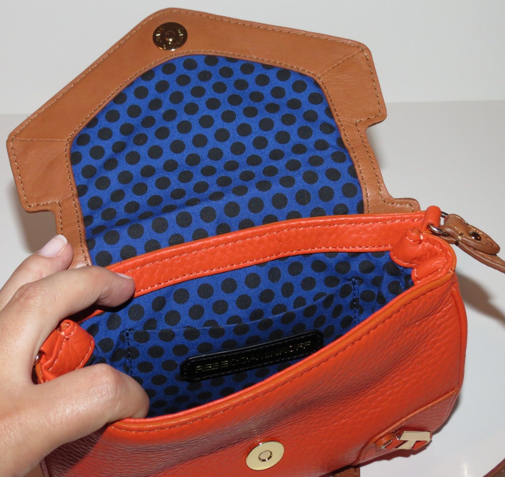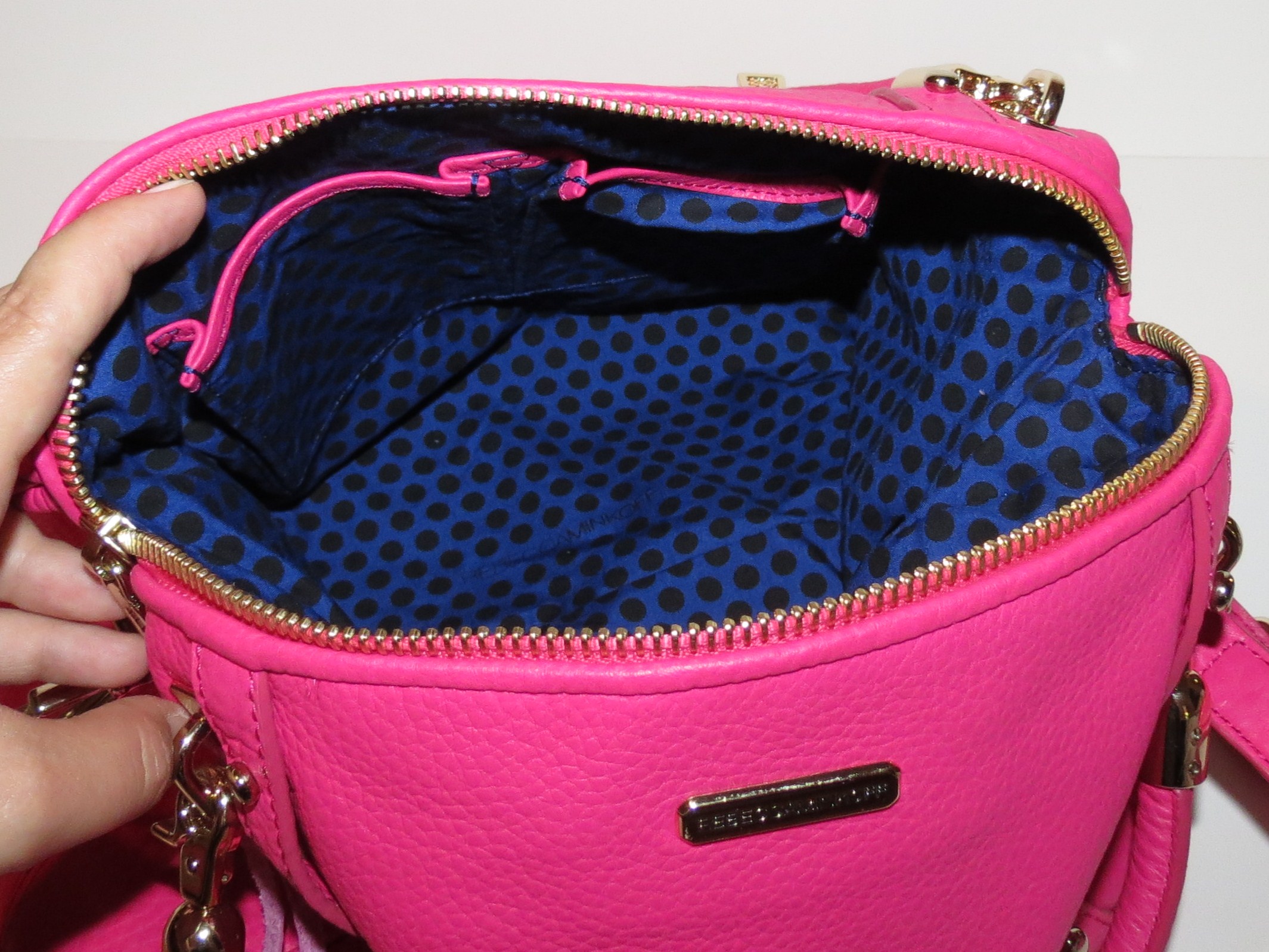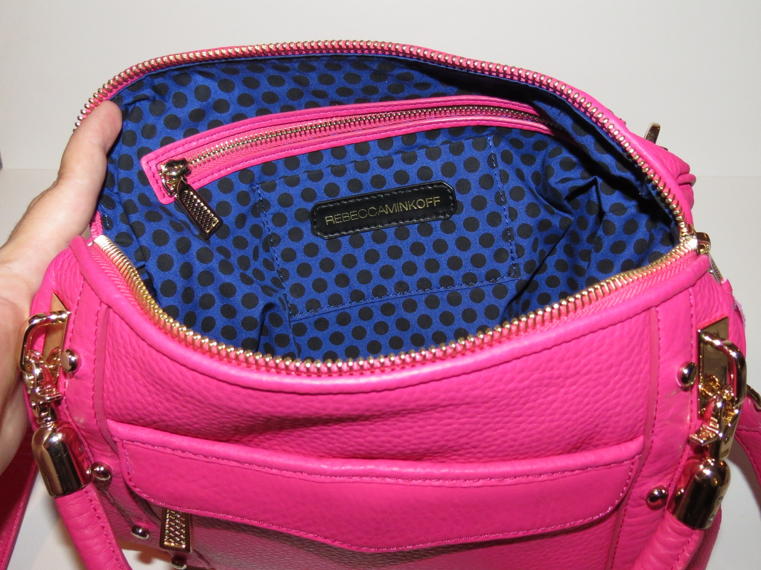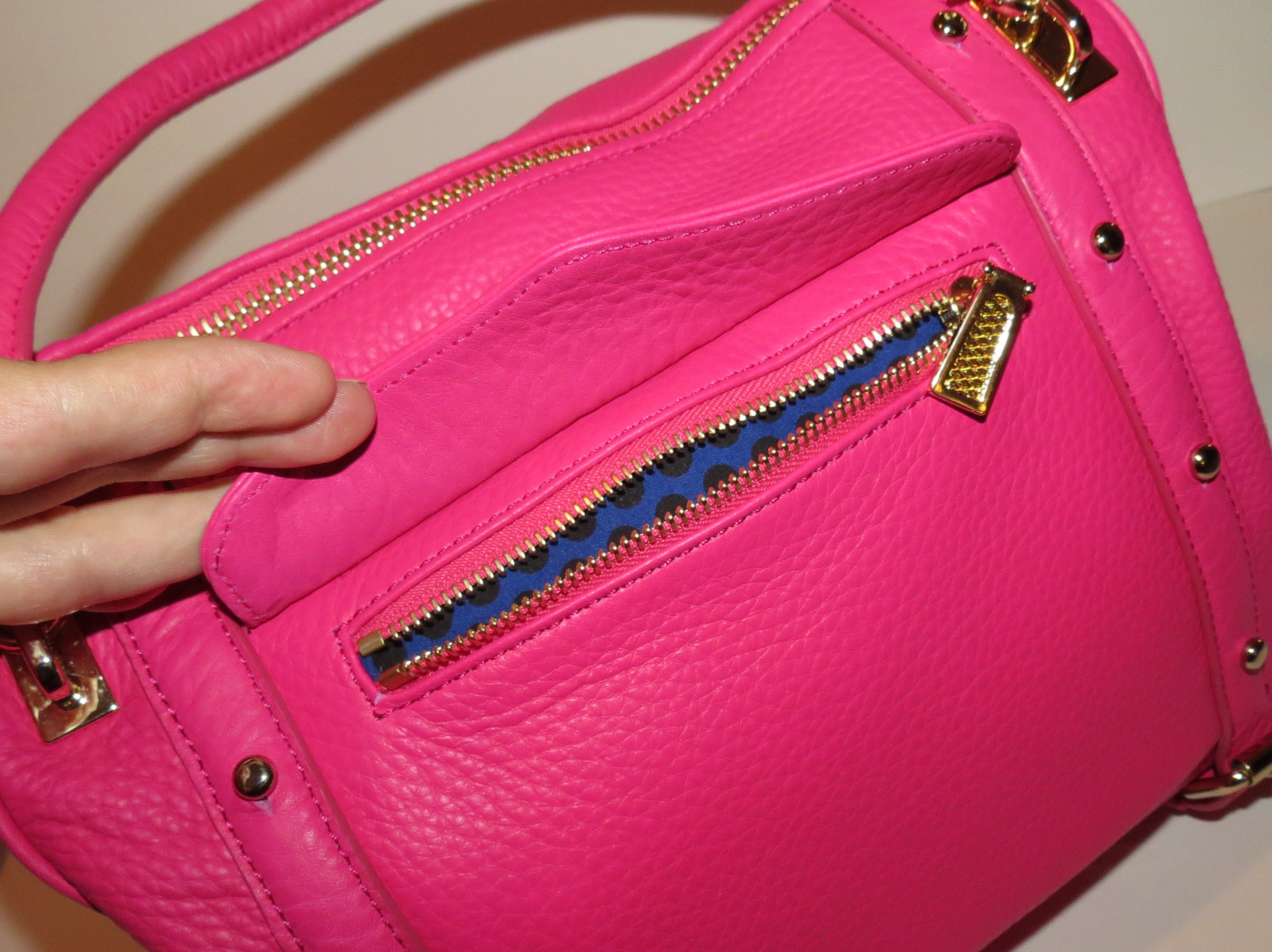 The exterior Bright Pink Pebbled Leather looks, feels and smells amazing. It pops against the interior, which is the signature Rebecca Minkoff blue with black polka dots and, of course, bright pink trim to match the exterior.