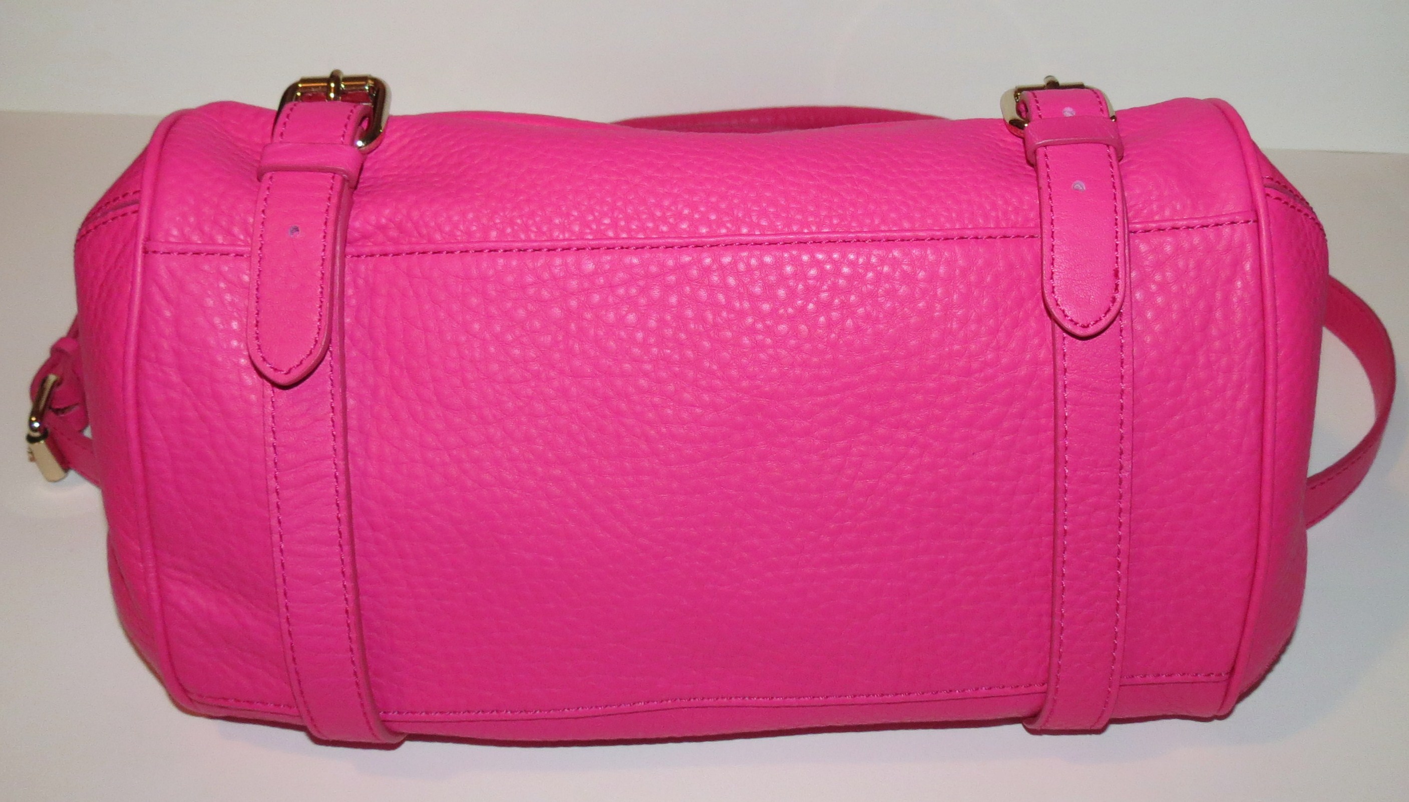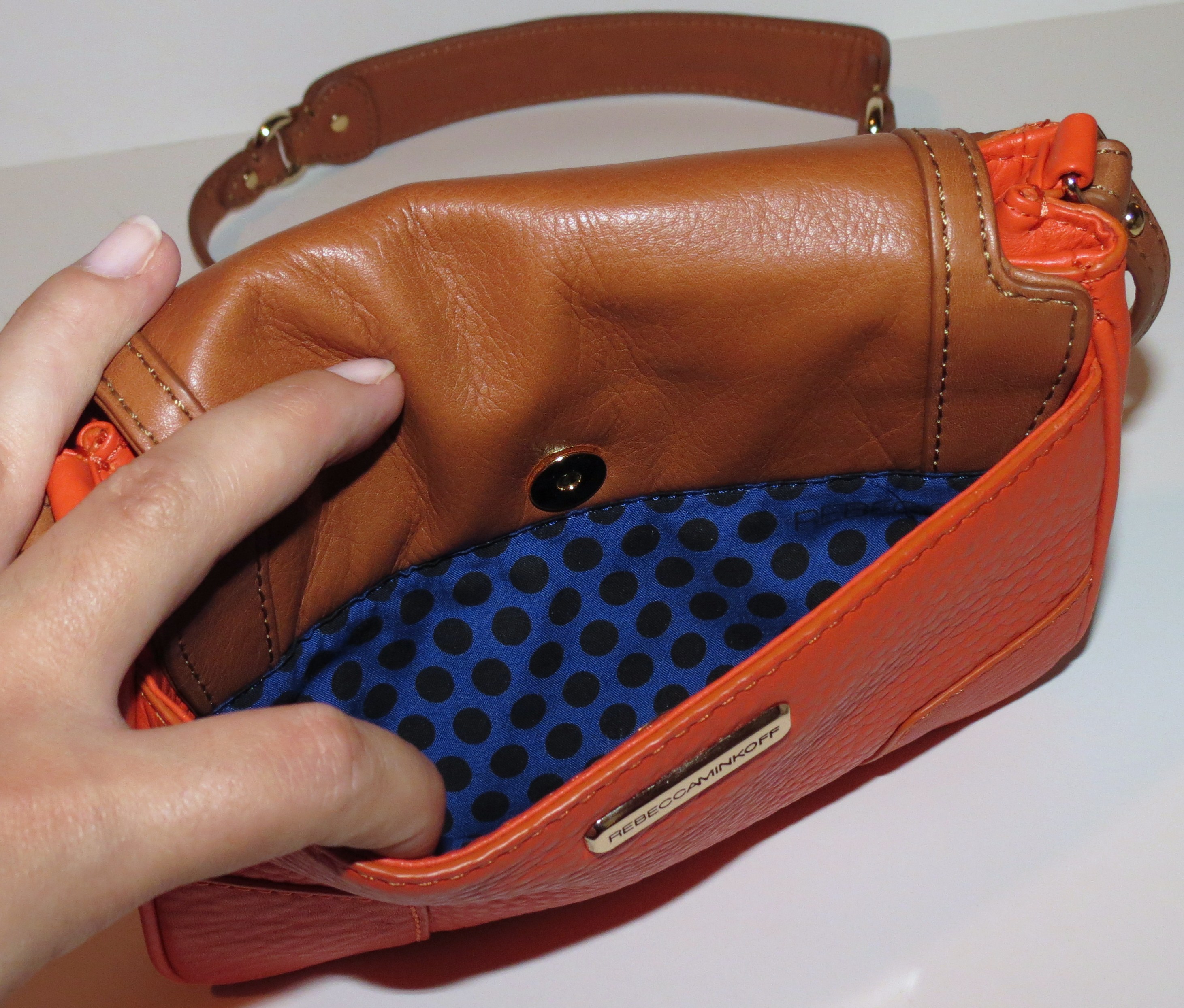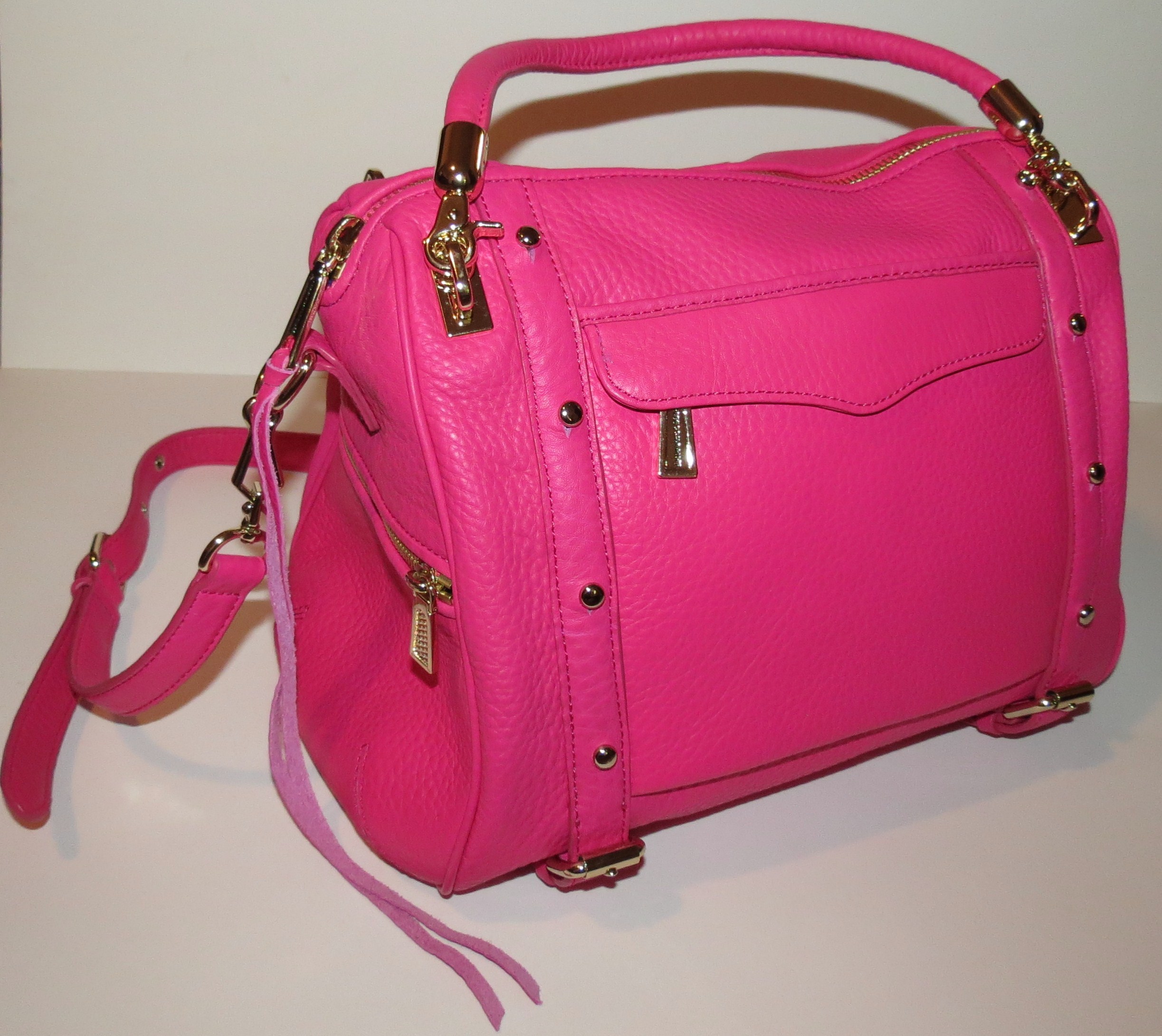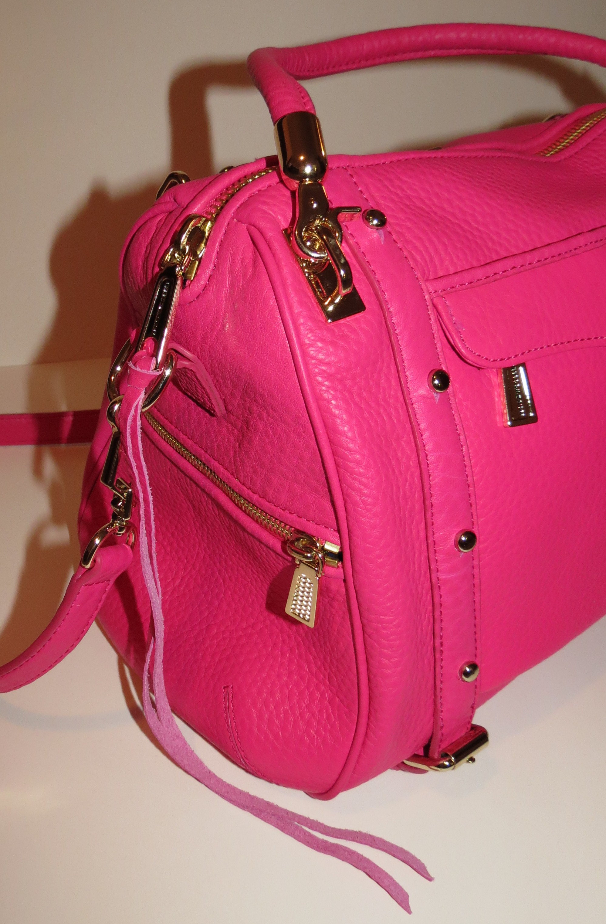 The exterior Bright Pink Pebbled Leather looks, feels and smells amazing. It pops against the interior, which is the signature Rebecca Minkoff blue with black polka dots and, of course, bright pink trim to match the exterior.