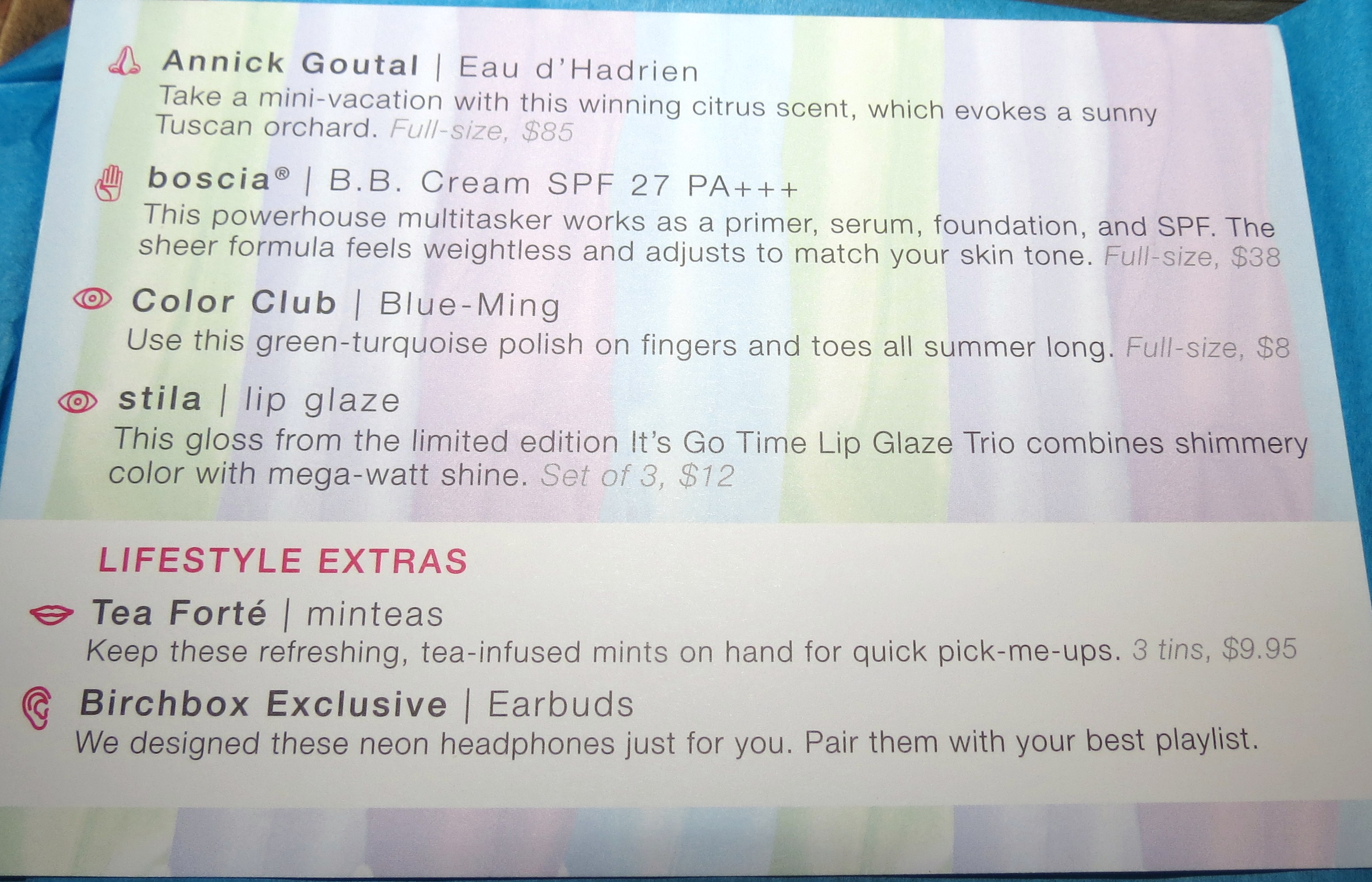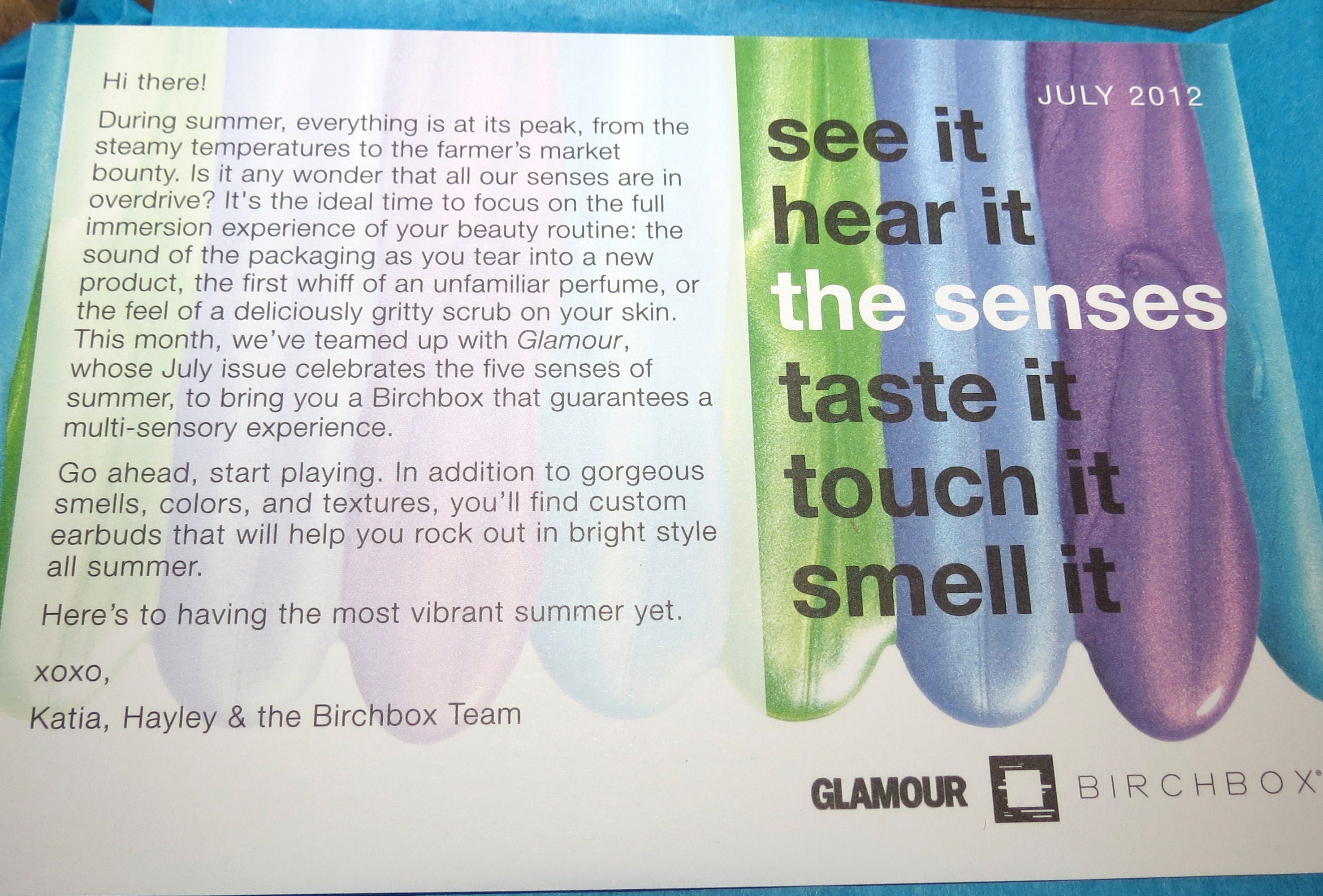 For July 2012, Birchbox has teamed up with Glamour Magazine to celebrate the five senses of Summer!