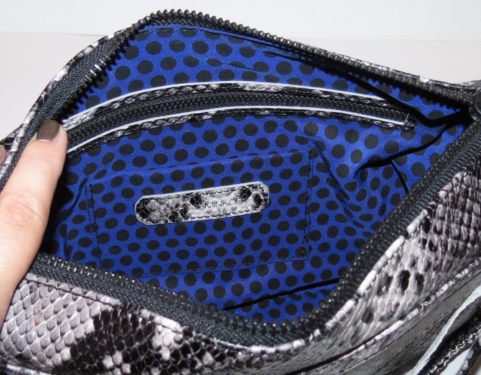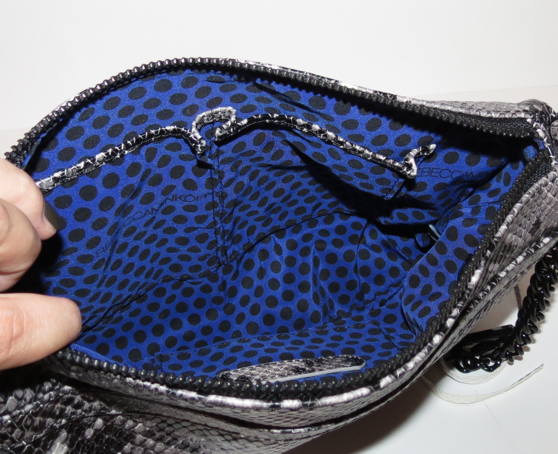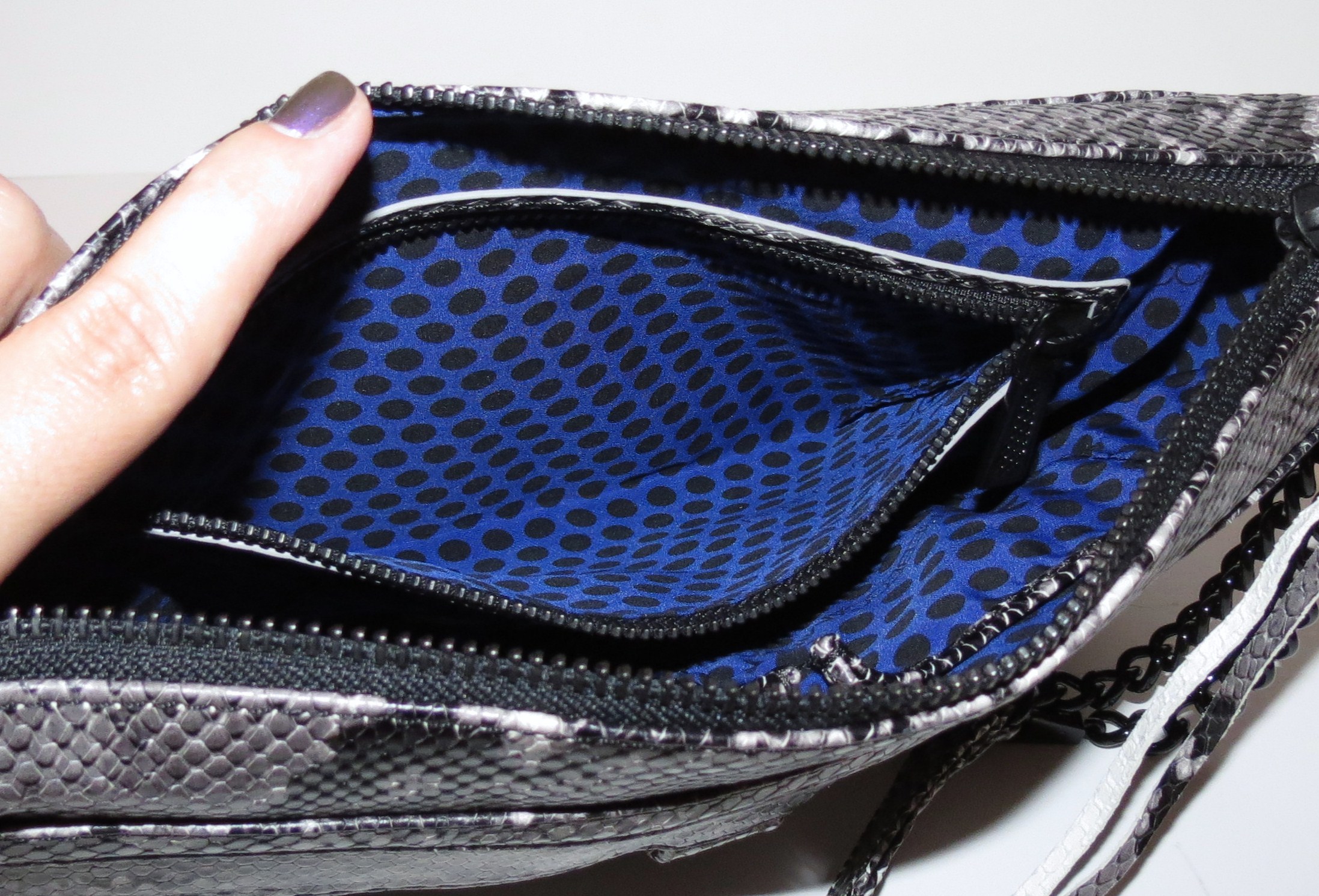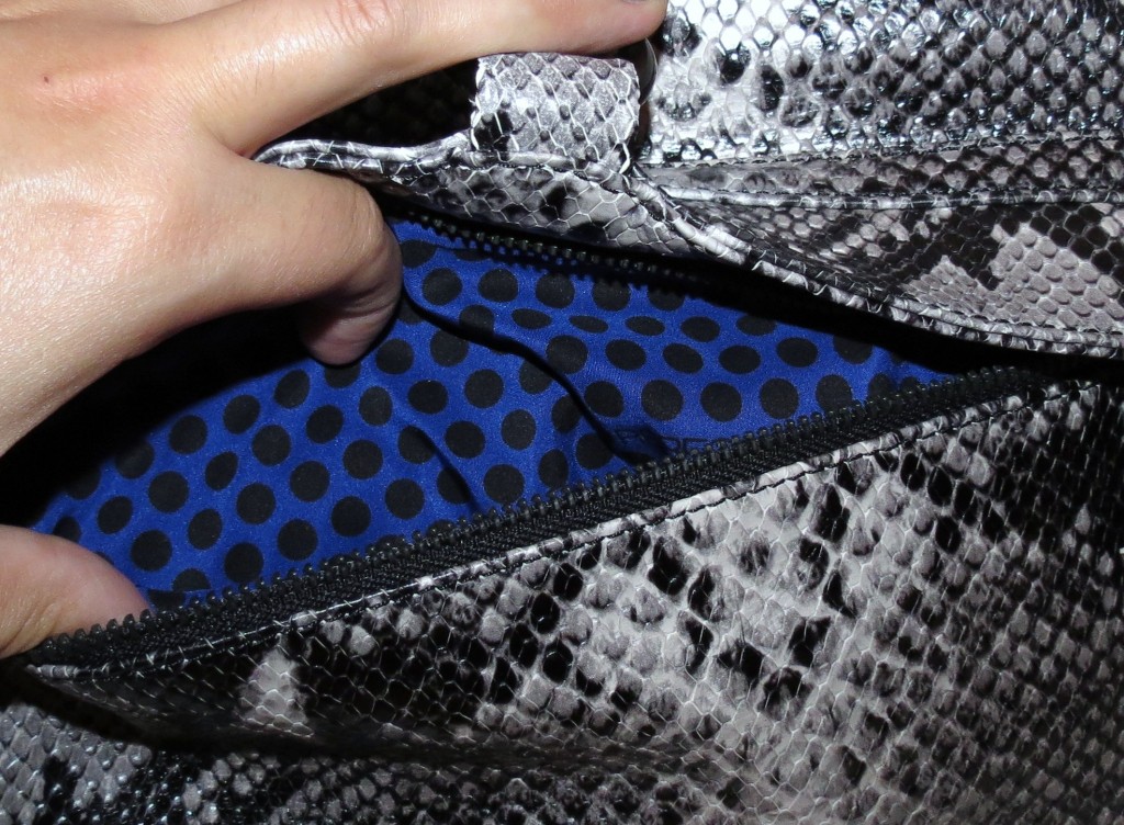 The bag looks cool witht they python print, but I feel like the black hardware and poka-dot interior just set it to another level of awesome. Its a great little evening bag that can be both edgy and classy. Great find!!