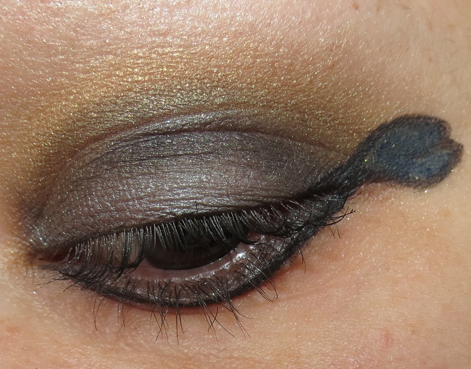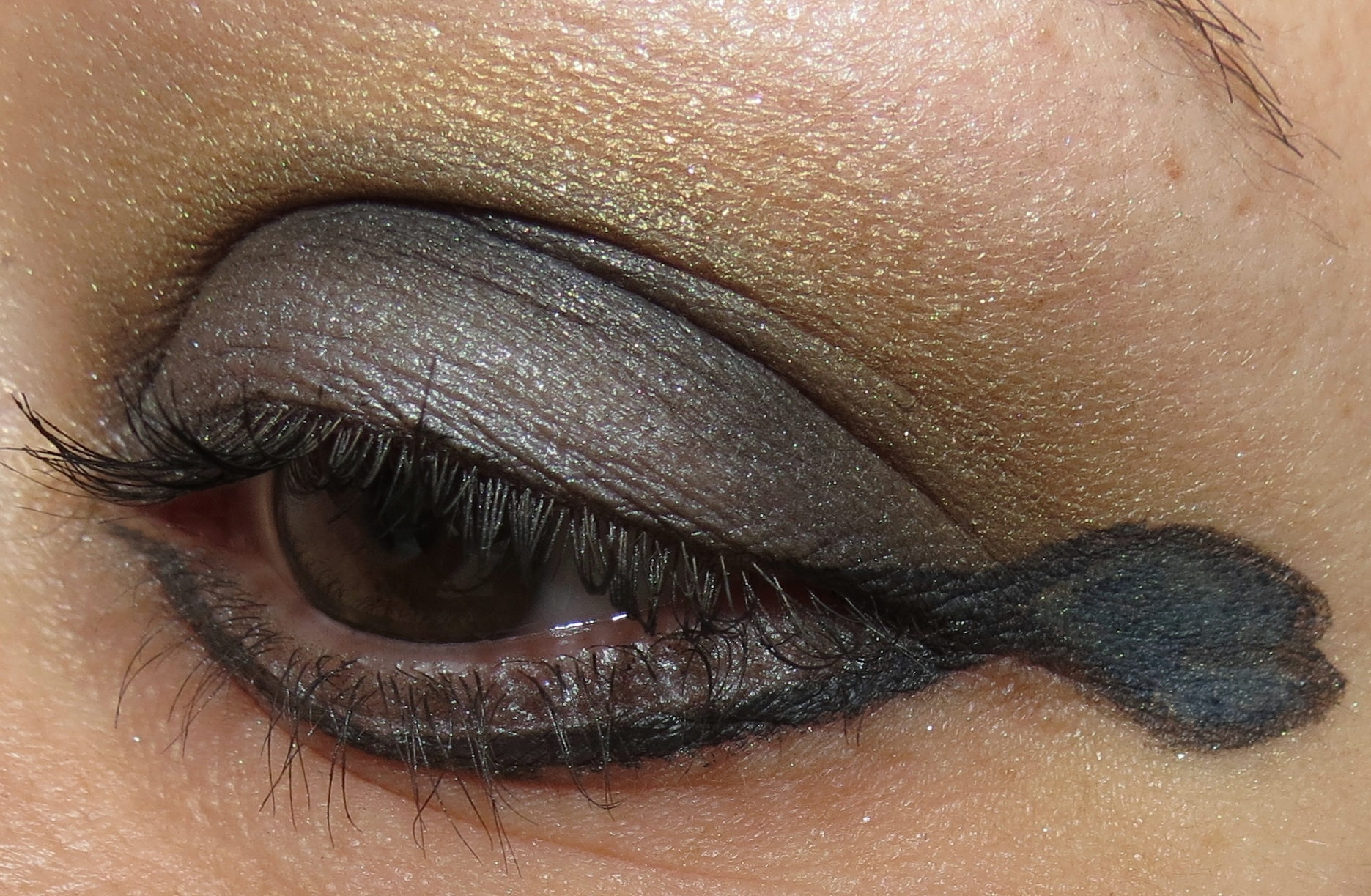 To get this look, just start your liner at the very outer tip of the top lashes and create your shape. Bring down the liner and end underneath the lower lashes, leaving space for some shadow. The shadows used in this look are all from the Le Metier de Beaute Melange Palette charcoal black on the lid, silver right above the upper and right below the lower lashes, gold in the crease and blended up. The liners used are NARS Carpates & Atlantic and the mascara is MAC Plushlash.