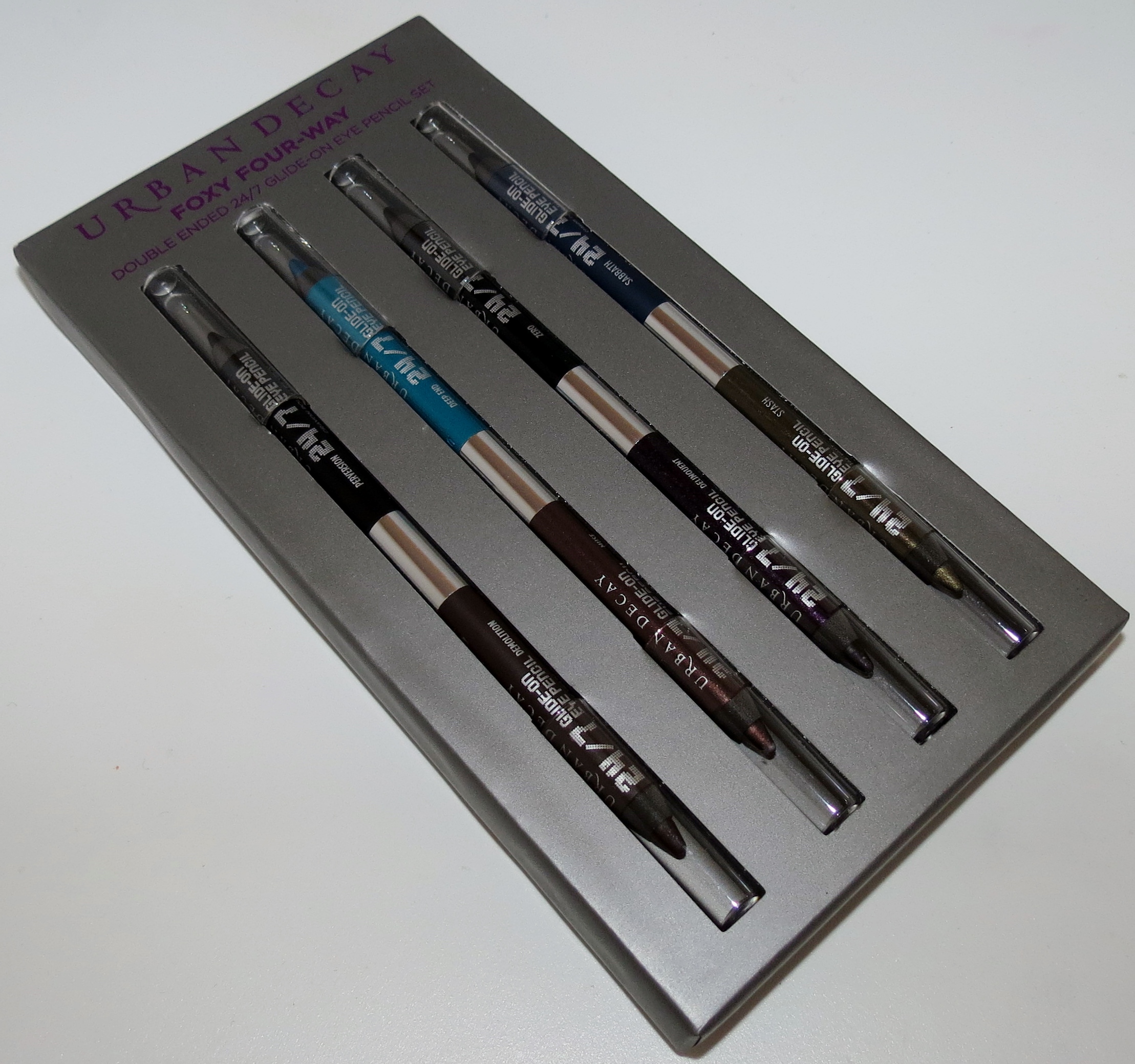 Luckily, Sabbath was included in the Urban Decay Foxy Four-Way Double Ended 24/7 Glide-On Eye Pencil Set, along with 7 other shades - Zero, Perversion, Muse, Stash, Deep End, Delinquent and Demolition.