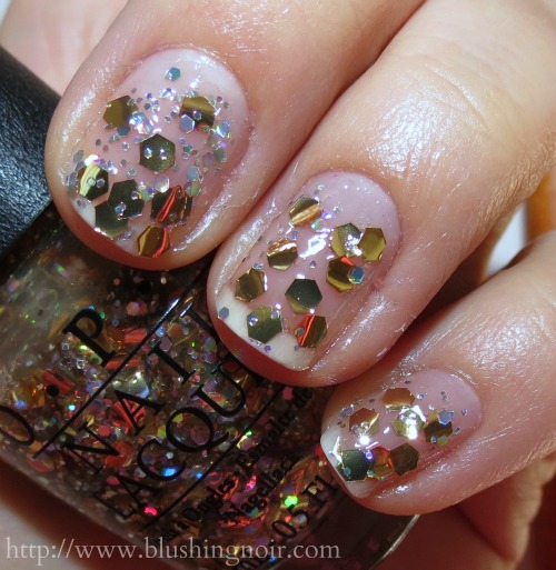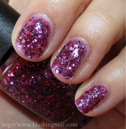 Blush Hour has a sheer raspberry jelly base and a truck load of different sized fuchsia and purple hex glitters. Three coats.