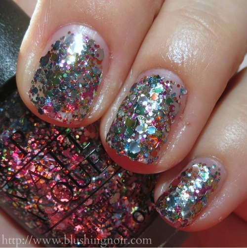 Chasing Rainbows is a rainbow of different sized hex glitters in every color of the rainbow and some silver. Near identical to Rainbow Connection from OPI The Muppets Collection Holiday 2011 but I think this one has more silver. Three coats.