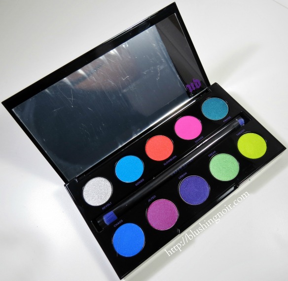 - 10 pressed pigments in Revolt (bright metallic silver shimmer with silver glitter), Gonzo (bright turquoise matte with floating tonal pearl), Slowburn (bright red-orange matte with floating pearl), Savage (bright hot pink matte), Fringe (bright metallic teal), Chaos (bright blue matte with floating tonal pearl), Jilted (bright metallic fuchsia with blue shift), Urban (bright metallic purple), Freak (bright green with gold shift), and Thrash (bright lime green matte with floating gold pearl)