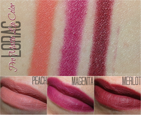 Next is the Pro Matte Lip Color ($16.00). These are available in 12 shades and I have 3 to share with you today in Peach, Magenta and Merlot. I am in major love with these. They’re creamy but don’t feel like they’re drying your lips out. I ate a bagel, drank my coffee and didn’t need to reapply at all. After lunch I needed to touch up a bit towards the center, but if you don’t have time for that you can always add a clear gloss until you can grab a mirror. I’m 100% positive that I need every one of these. (Tip: be sure to exfoliate the lips before you apply!).