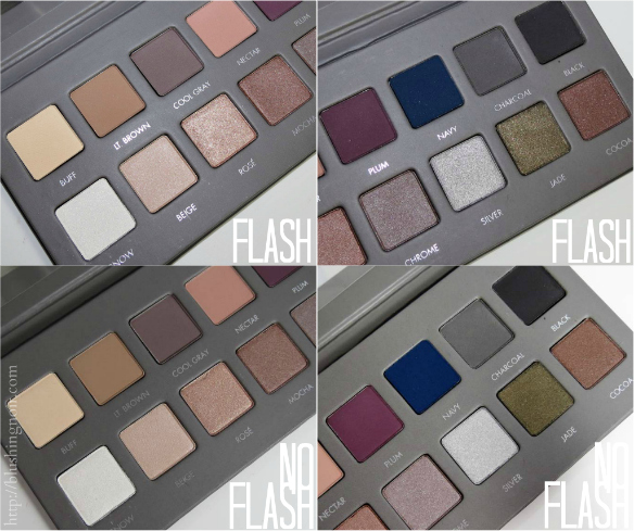 Below I photographed the shades with and without flash so you can see the dimension & also the truest hues to the eye shadows.