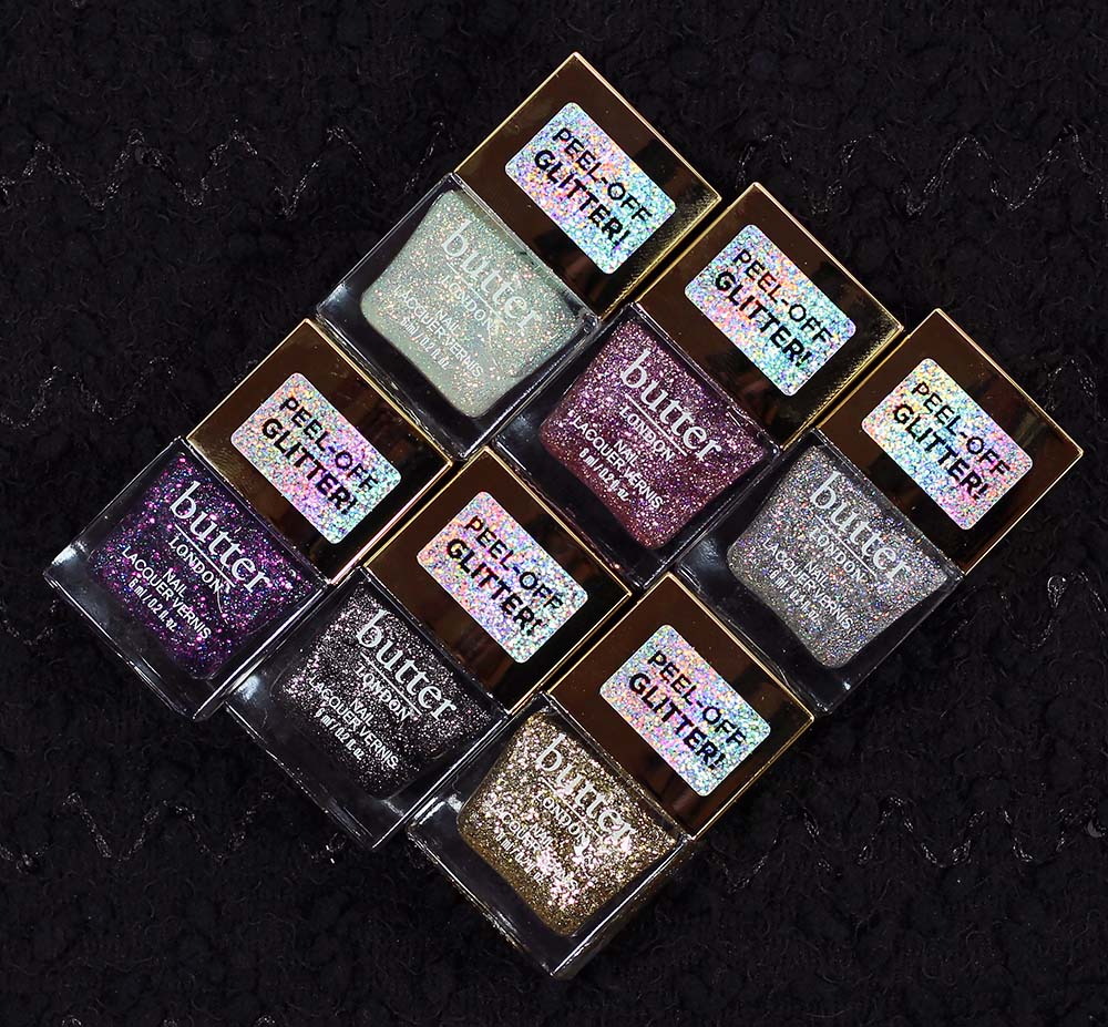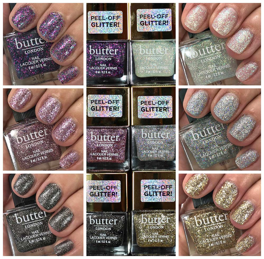 Each shade from the Butter London Glazen Peel-Off Glitter Nail Polish Collection is swatched below using no base coat, two coats of polish and no top coat.