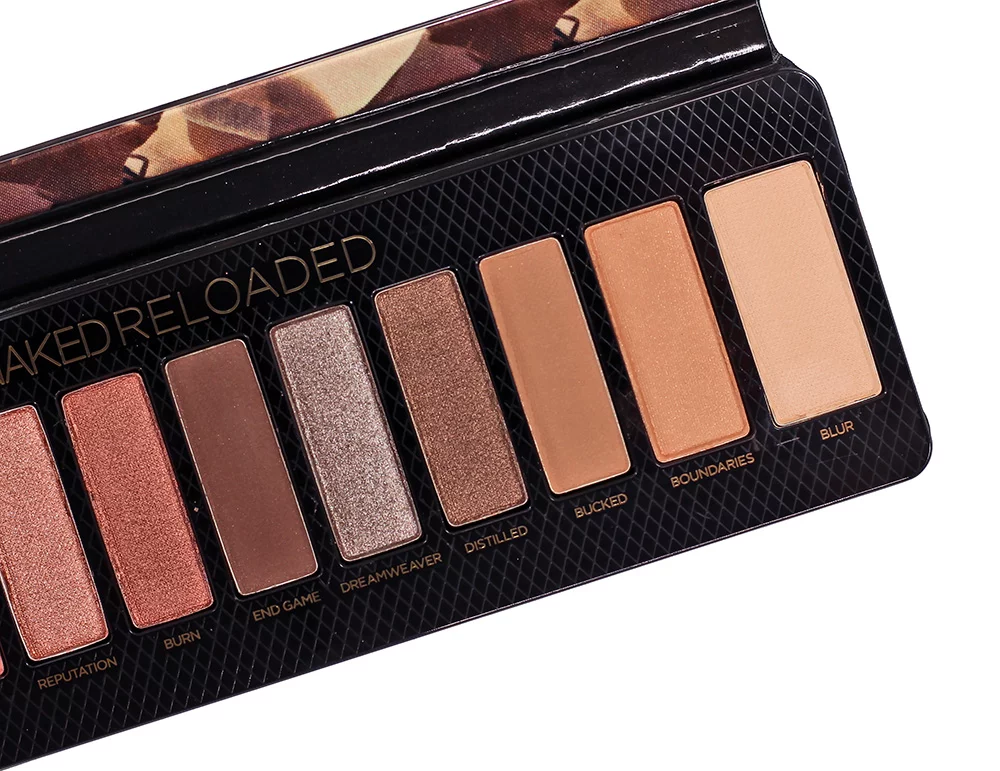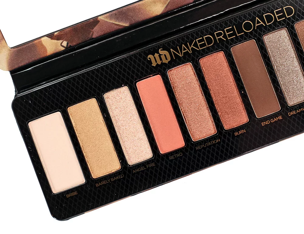 The Urban Decay Naked Reloaded Palette includes 12 eyeshadow shades housed inside a slim, lightweight and satin feeling palette. The outer fabric is plush and feels somewhat like a pillow, which is a change for UD. There is also a mirror at the interior and, surprisingly, no eyeshadow brush.