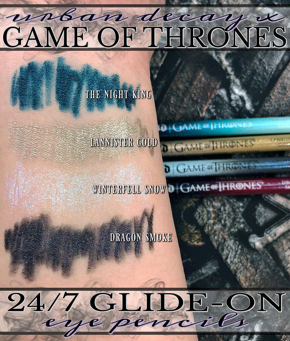 Urban Decay x Game of Thrones 24/7 Glide-On Eye Pencil Review | Dragon Smoke, Winterfell Snow, Lannister Gold and The Night King