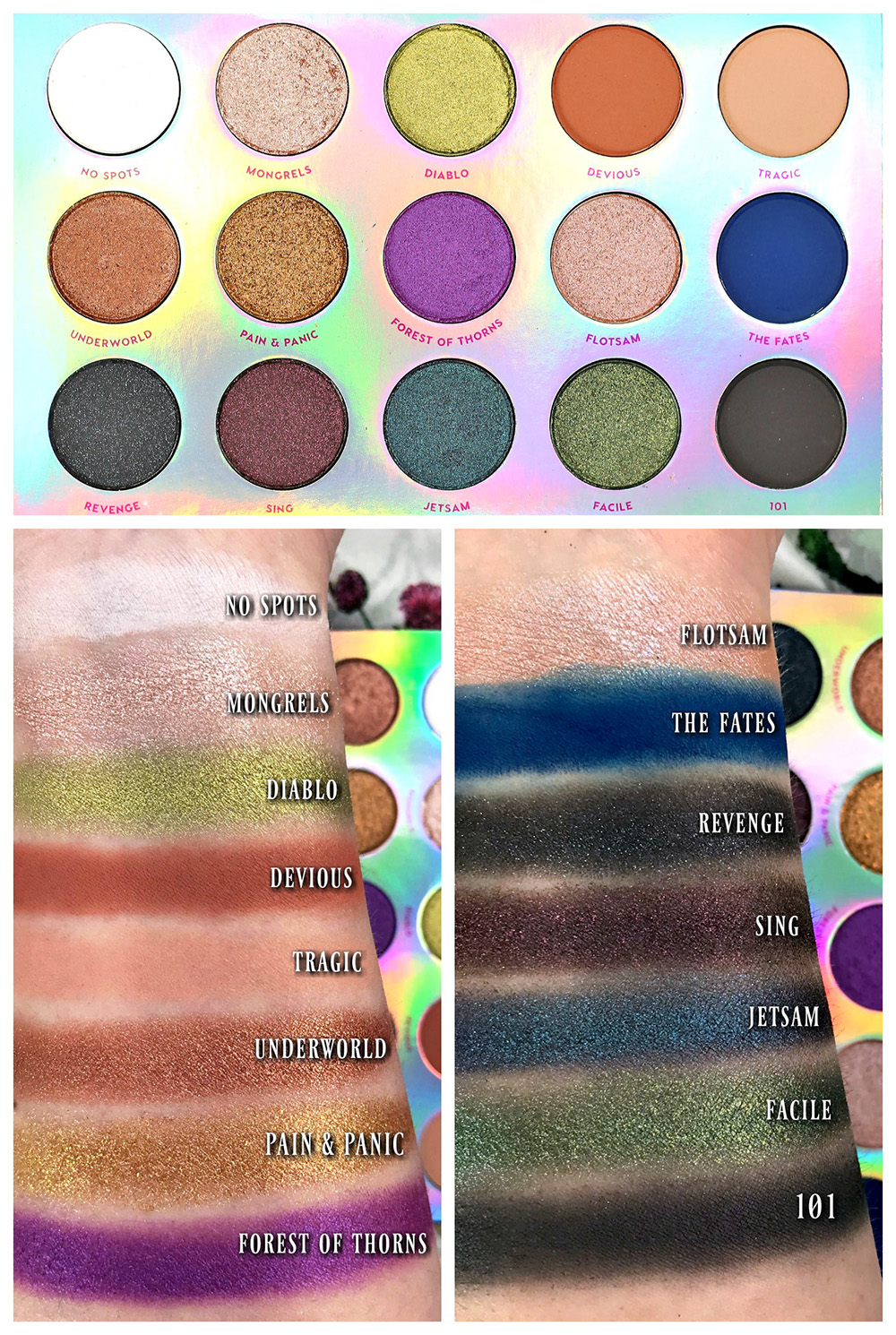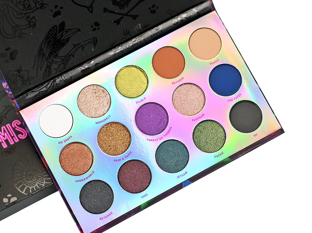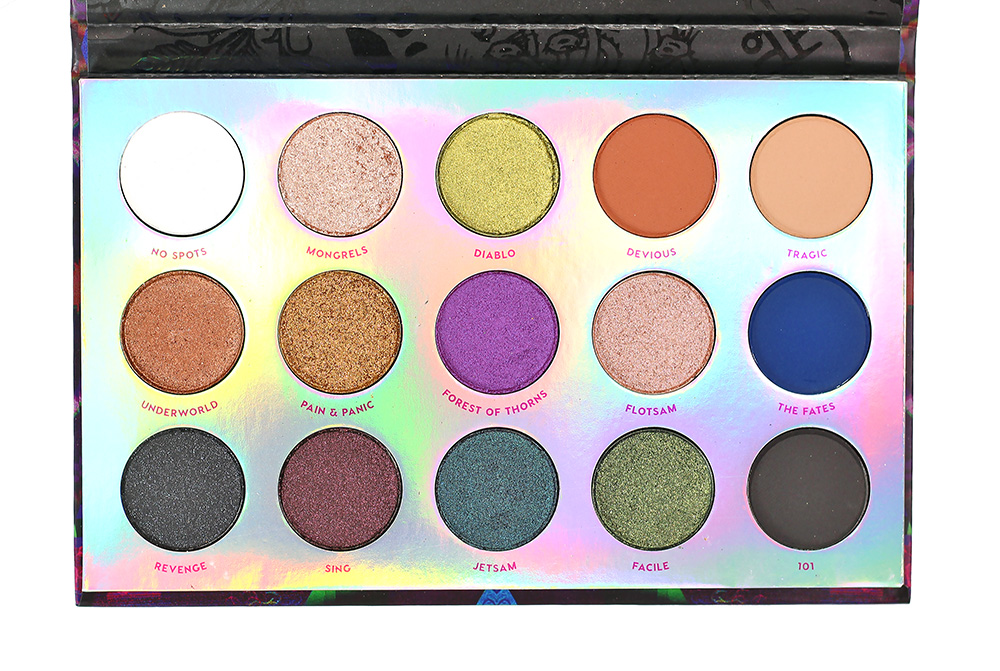The interior features the 15 eyeshadow shades in various finishes (duochrome, metallic and matte) in a holo setting. While there isn’t a mirror opposite the shadows there is some fun, shiny black “evil” clip art set on a matte black background. The packaging itself is a sturdy cardboard.