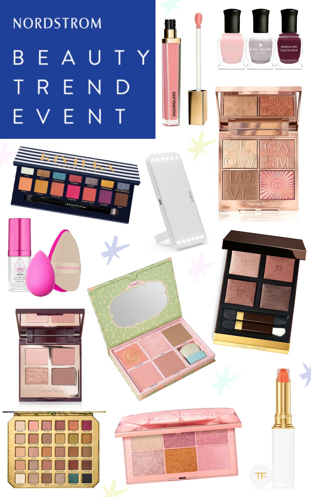 Shown: Anastasia Beverly Hills Riviera Eyeshadow Palette ($45.00) | BeautyBlender Glow All Night Set ($35.00) | Benefit Cheekleaders Pink Squad Cheek Palette ($60.00) | Charlotte Tilbury Glowgasm Face Palette in Lightgasm ($75.00) | Charlotte Tilbury Pillowtalk Eyeshadow Palette ($53.00) | Deborah Lippmann x Kate Spade Fairytale of New York Nail Polish Set ($24.00) | Hourglass Unreal Shine Volumizing Lip Gloss in Enchant ($30.00) | NARS Endless Orgasm Palette ($49.00) | RIKI Cutie Portable Lighted Mirror ($55.00) | Tom Ford Body Heat Eye Color Quad ($88.00) | Tom Ford Scorching Lip Gelee ($55.00) | Too Faced Natural Lust Naturally Sexy Eyeshadow Palette ($59.00)