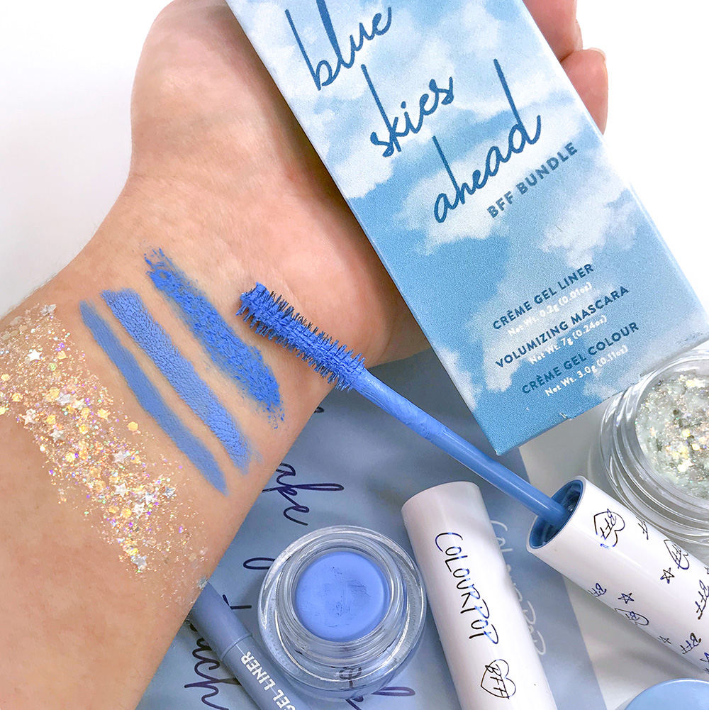 In the Colourpop Blue Skies Ahead BFF Bundle you’ll get three FULL SIZE periwinkle products - Sky High Volumizing Mascara, Prance Creme Gel Liner & Prance Cream Gel Colour.