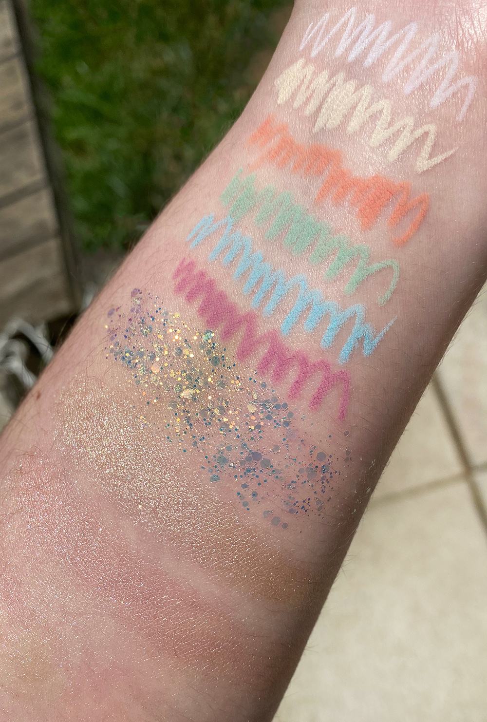 I hesitate to call this an eye shadow palette since the brand does not. Personally, I can use these shades on my eyes, but you might find that you’re more sensitive to the pigments. For the glitters I keep them away from the inner corner of the eye ALWAYS. In this particular palette Law of Attraction and Loves It are listed as “pressed pigments” so those would be the ones to watch for in terms of wearing on the eyes.