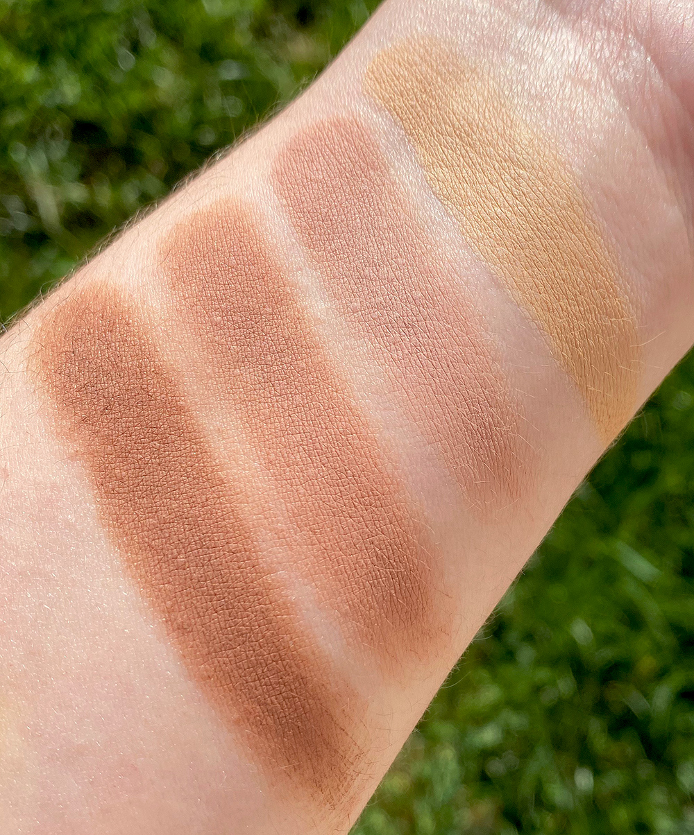 Below the Colourpop Cream Shadows are swatched below dry and on bare skin (no primers). The photo was taken outside, in natural sunlight. Top to bottom: Bronco, Laurel, Camouflage, and Moonbeam.