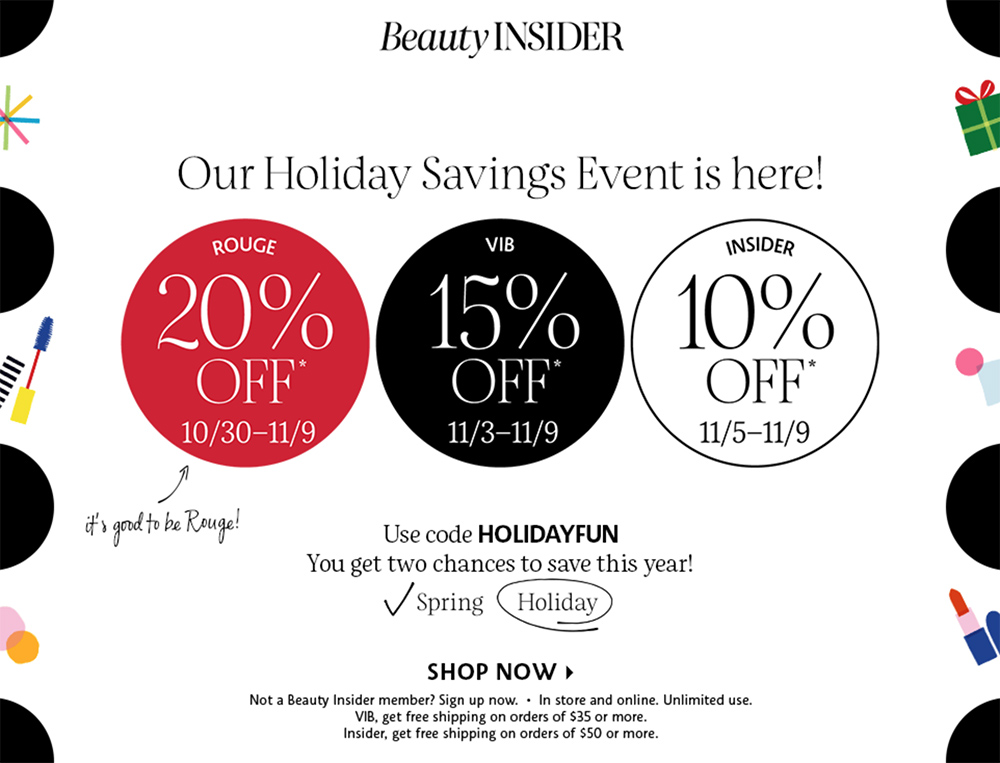 Because I’m not a VIB Rouge anymore I had to wait until today to make my purchases. Rouge members shopped a few days early and at 20% off but I found that I didn’t have any problems getting what I wanted as a regular old VIB member with my 15% off. Beauty Insiders get 10% off and can start shopping on November 5. This sale ends for us all on November 9.