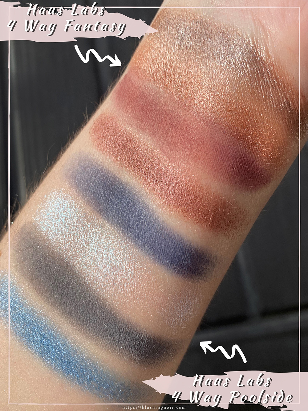 The swatches of Haus Labs 4-Way Shadow Palettes in 4 Fantasy and 4 Poolside are done dry and on bare skin (no primers). The photo was taken outside in more overcast sunlight (thanks, PA weather).