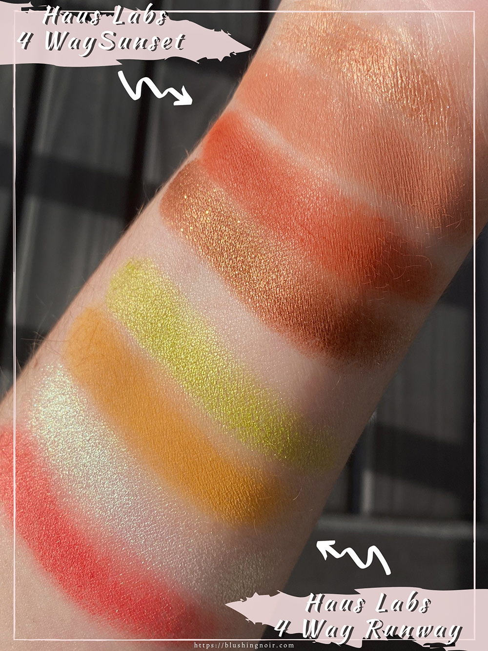 The swatches of Haus Labs 4-Way Shadow Palettes in 4 Runaway and 4 Sunset are done dry and on bare skin (no primers). The photo was taken outside in direct sunlight.