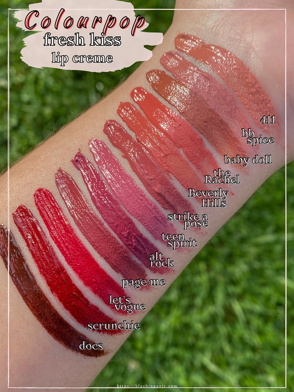All 12 Colourpop Fresh Kiss Lip Cremes shades are swatched below on bare skin (no primers). The photo was taken outside in the morning light.