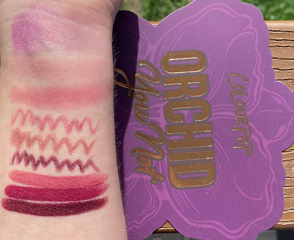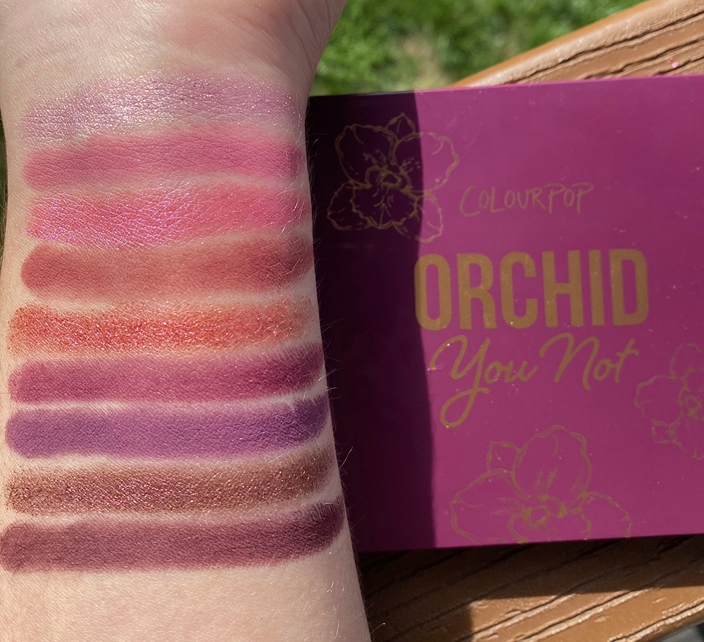 The Colourpop Orchid You Not Palette (shown swatched above) includes 9 shades of purple toned finishes in mattes and metallics.
